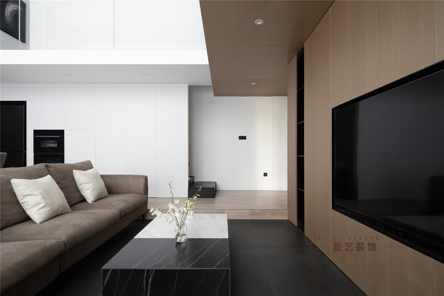 客廳:簡潔的設計,大面積的百葉窗制造極好的光影效果,不管任何天氣都擁有最佳的采光,內嵌的電視機搭配下沉式空間的處理手法帶給業主沉浸的舒適體驗,主色調黑白灰,在各個區域中都有獨立的對應系,精簡而規整,大方而得體。