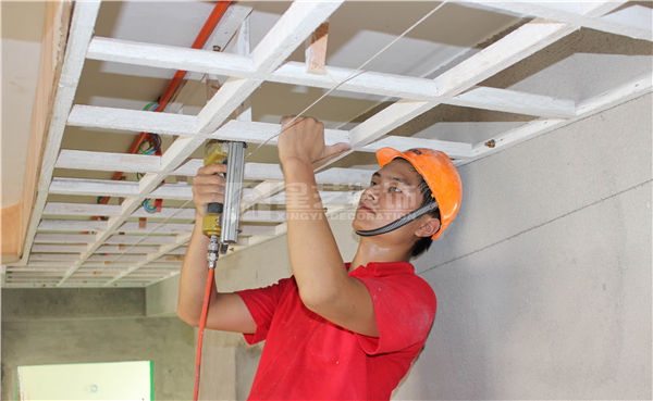 次龍骨直接卡扣在主龍骨上,次龍骨與邊龍骨用打柳釘連接。
