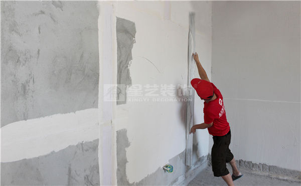 3、墻面找平:2m刮尺先將二條沖筋條中間刮平,待中間干后再刮上下部分。
